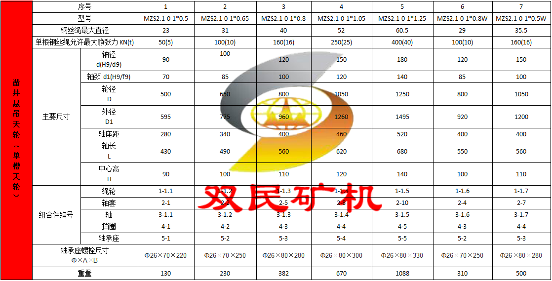 鑿井懸吊天輪是按JZ系列鑿井絞車鋼絲繩最大靜張力分別為5t(50kN),10t(100kN),16t(160kN),25t(250kN),40t(400kN)進(jìn)行配套設(shè)計(jì)的。