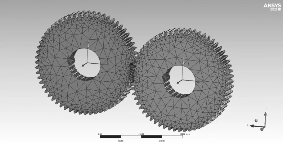 選用 ANSYS/Workbench 中的瞬態(tài)動(dòng)力學(xué)模塊,對(duì)同步齒輪的嚙合過程繼續(xù)動(dòng)態(tài)仿真分析。齒輪嚙合分析主要針對(duì)齒輪的接觸壓力以及zui大等效應(yīng)力特性。設(shè)置同步齒輪嚙合仿真時(shí)間為0.3s,選取28個(gè)齒面進(jìn)行14對(duì)接觸,接觸類型為摩擦接觸,摩擦因數(shù)為0.2,法向剛度系數(shù)為1。根據(jù)同步齒輪的運(yùn)動(dòng)特性,確保齒輪只能繞 z 軸轉(zhuǎn)動(dòng)。齒輪瞬態(tài)分析約束與載荷施加情況如圖8所示。