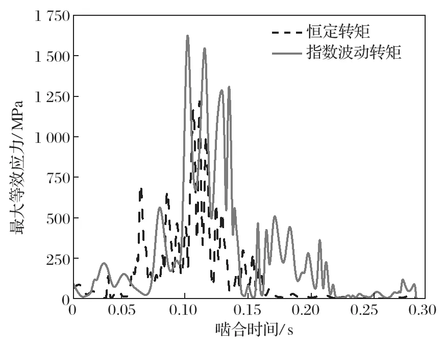 如圖12所示,一次波動轉(zhuǎn)矩的zui大等效應(yīng)力變化趨勢基本與恒定轉(zhuǎn)矩的zui大等效應(yīng)力變化趨勢一致,同樣是先增 大后減??;但是zui大等效應(yīng)力幅值變大,甚至超過了材料的屈服ji限。同時,由于一次波動轉(zhuǎn)矩的輸出,即使位于雙嚙合區(qū)時,其應(yīng)力波動相較于恒定轉(zhuǎn)矩輸出時的應(yīng)力波動也是更大。