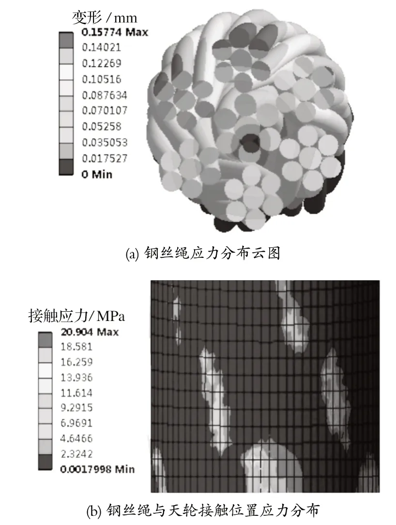 通過仿真結(jié)果可以看出,鋼絲繩的應力集中在繩芯處,在 Pro/Engineer 中添加求解項,計算鋼絲繩股內(nèi)的變形以及鋼絲繩和天輪接觸部位的應力,可以得到如圖7 所示的計算結(jié)果。
